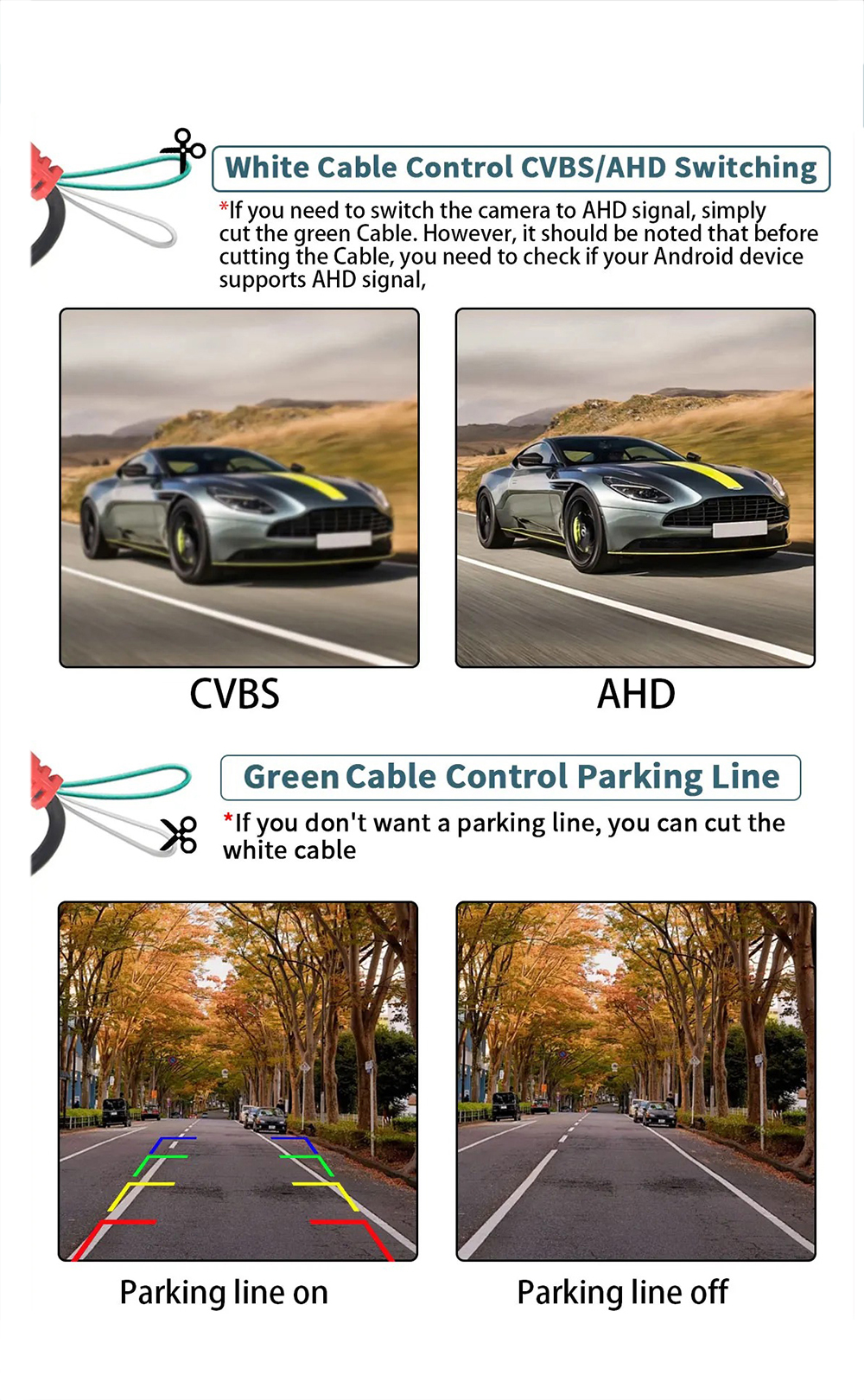 *If you need to switch the camera to AHD signal, simply cut the White cable. However, it should be noted that before cutting the cable, you need to check if your Android device supports AHD signal.|
